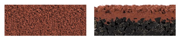 1-й слой - черный СБР-гранулят и полиуретановое связующее, монтаж осуществляется посредством специализированной машины Planomatic (производство компании SMG, Германия).